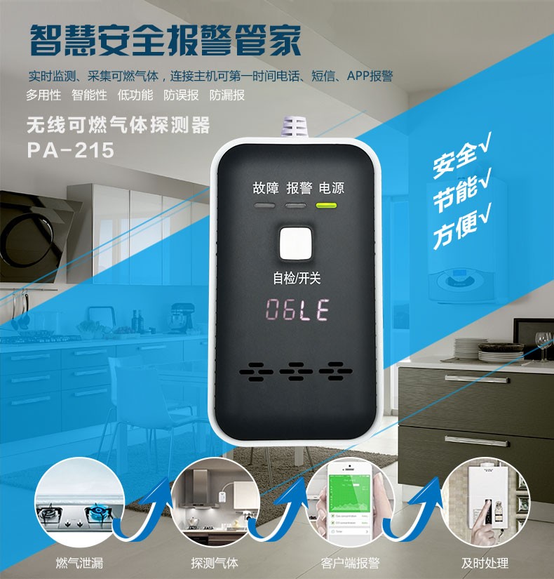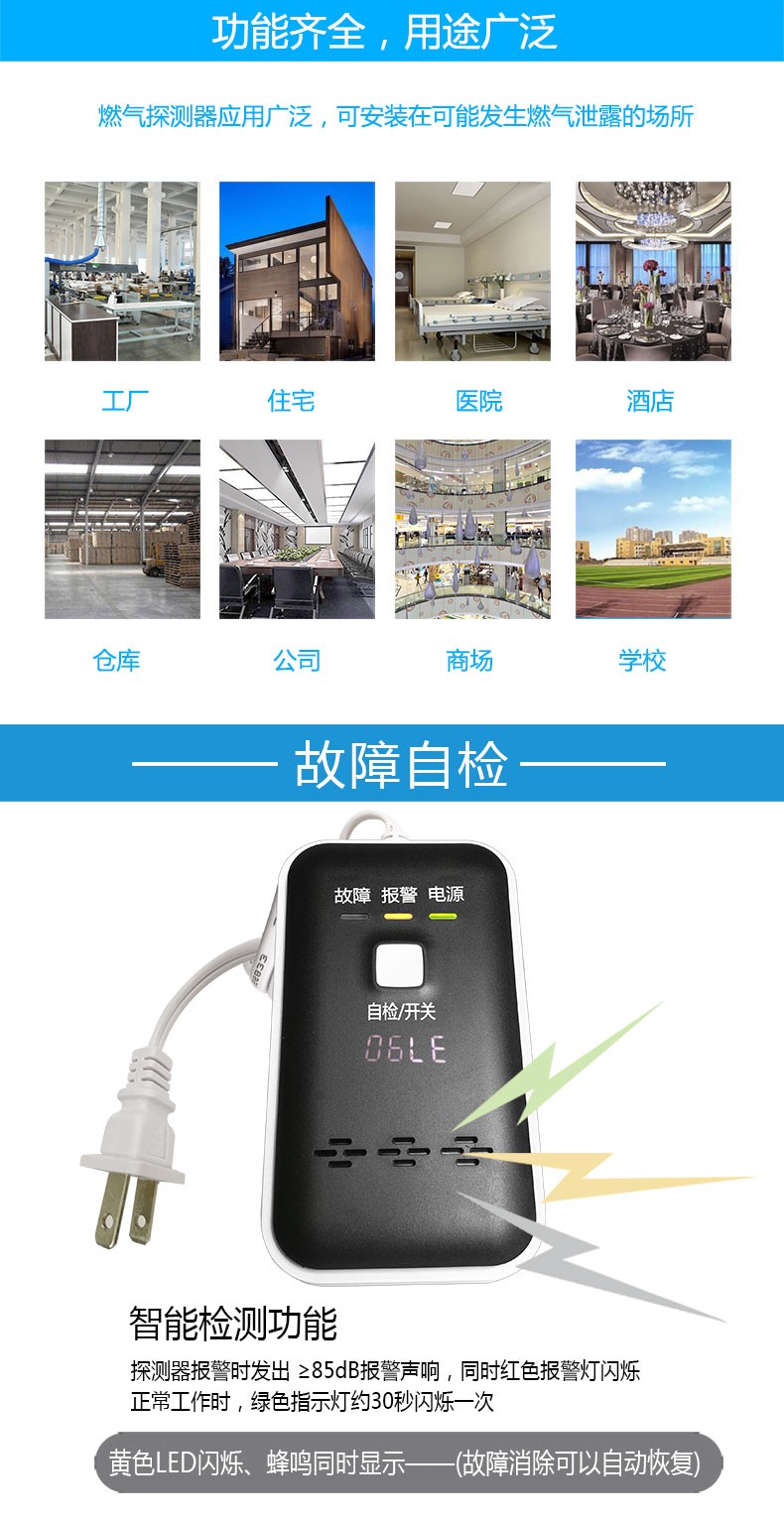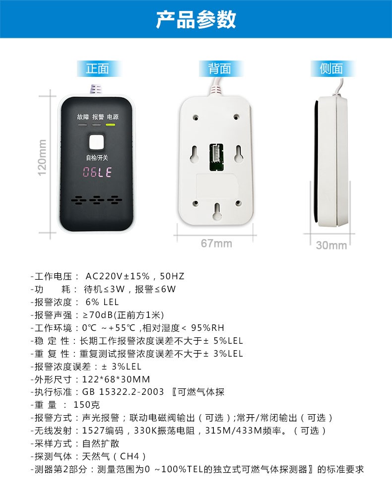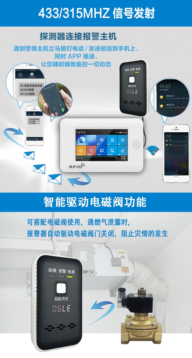 报警方式:声光报警;联动电磁阀输出(可选);常开/常闭输出(可选)