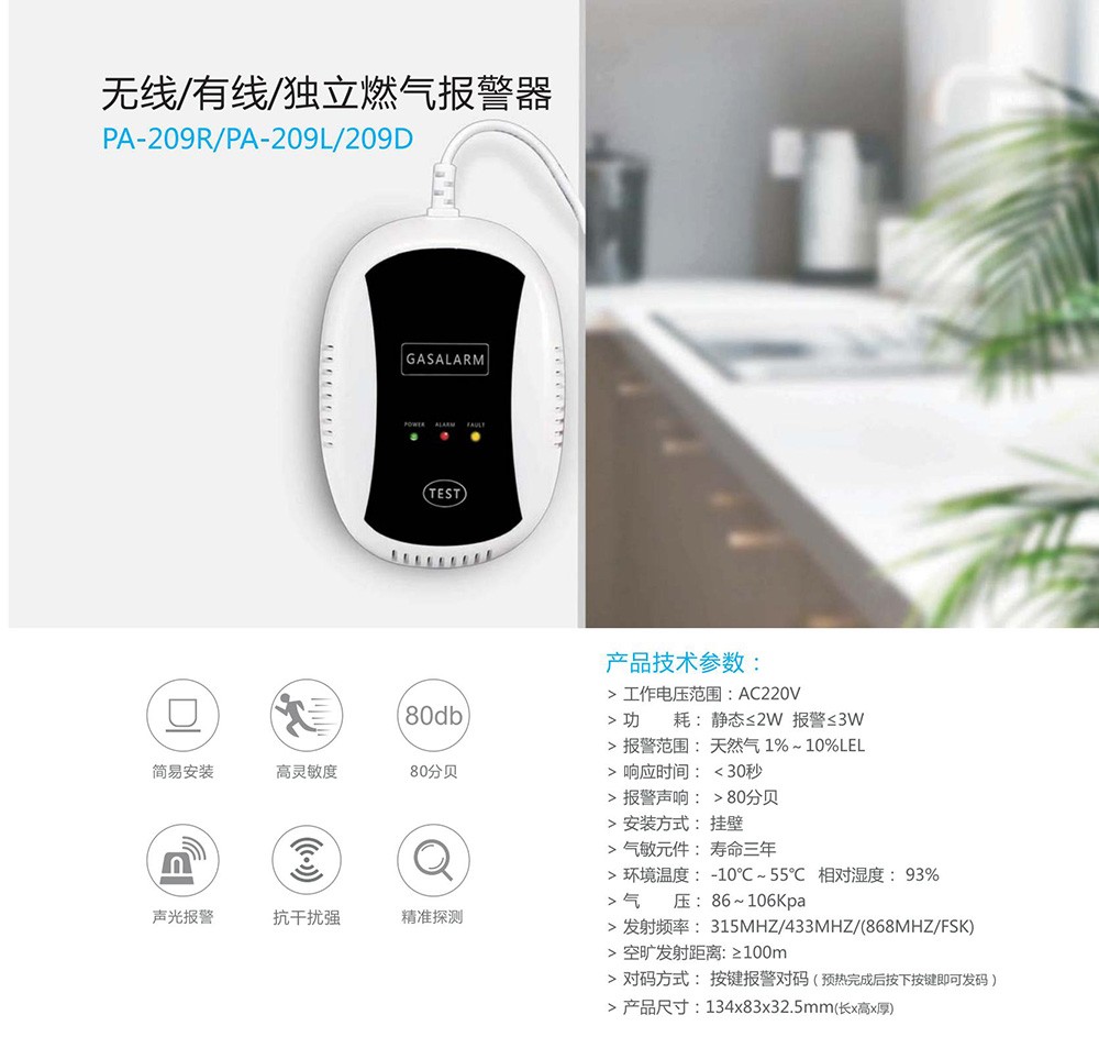家用无线燃气报警器 (型号PA-209)