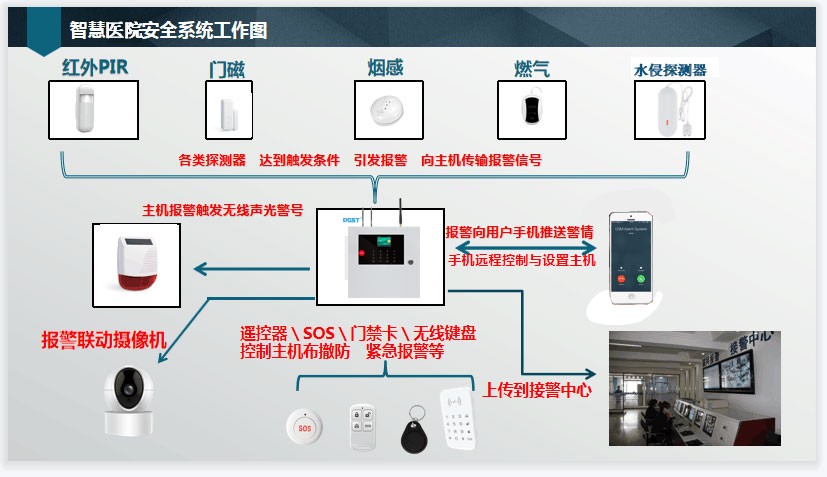 1) 对整个医院大楼的主要出入口、重要部门、重要保护区域进行报警监控,有效的预防各类案件的发生,并对各个科室进行安装探测器。